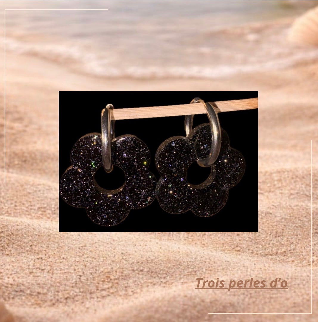Boucles d'Oreilles Créoles Résine UV Pailletée Fleur - Bijou Artisanal