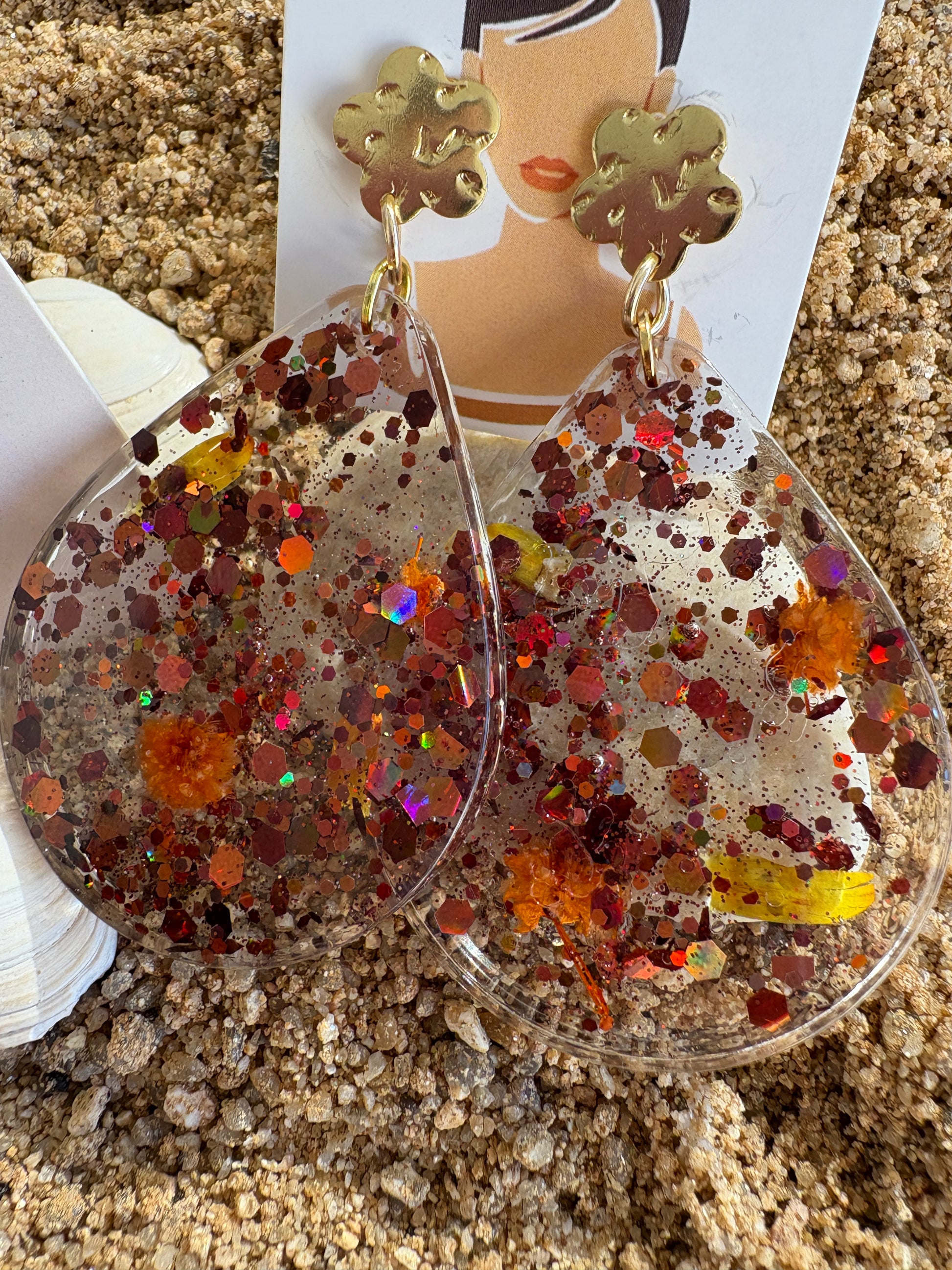 Each pair is unique thanks to the natural arrangement of flowers and glitter in the resin. These lightweight earrings are perfect for everyday wear or for a special occasion.
