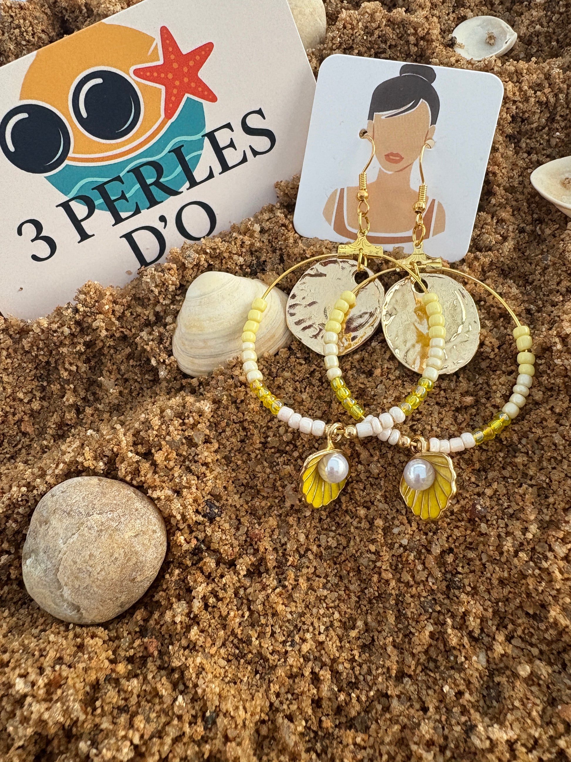 Les boucles d'oreilles Anna allient finesse et originalité grâce à leurs perles de rocaille jaunes minutieusement assemblées à la main. Ornée de breloques coquillages assorties, apportant une touche naturelle et lumineuse mais distinctives, elles subliment élégamment votre tenue tout en reflétant un savoir-faire artisanal d’exception.