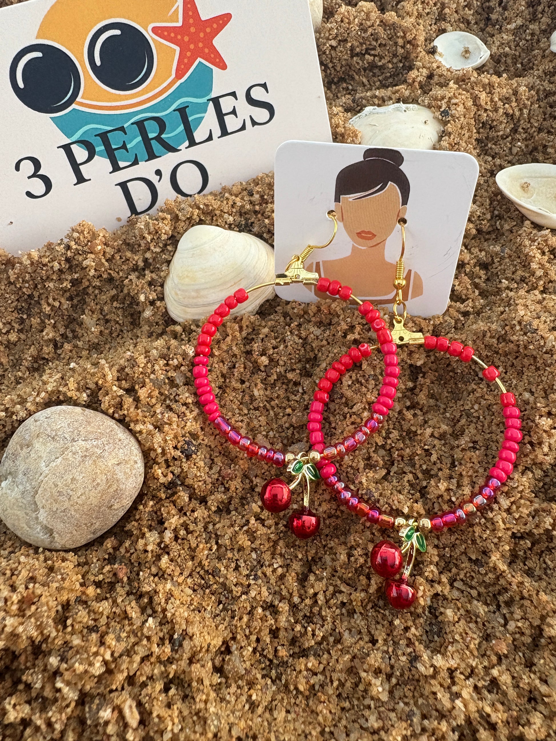Les boucles d'oreilles Louise, fabriquées à la main avec soin, combinent des perles de rocailles rouges et une breloque cerise pour une création artisanale unique et raffinée, offrant une touche raffinée et originale à votre style.