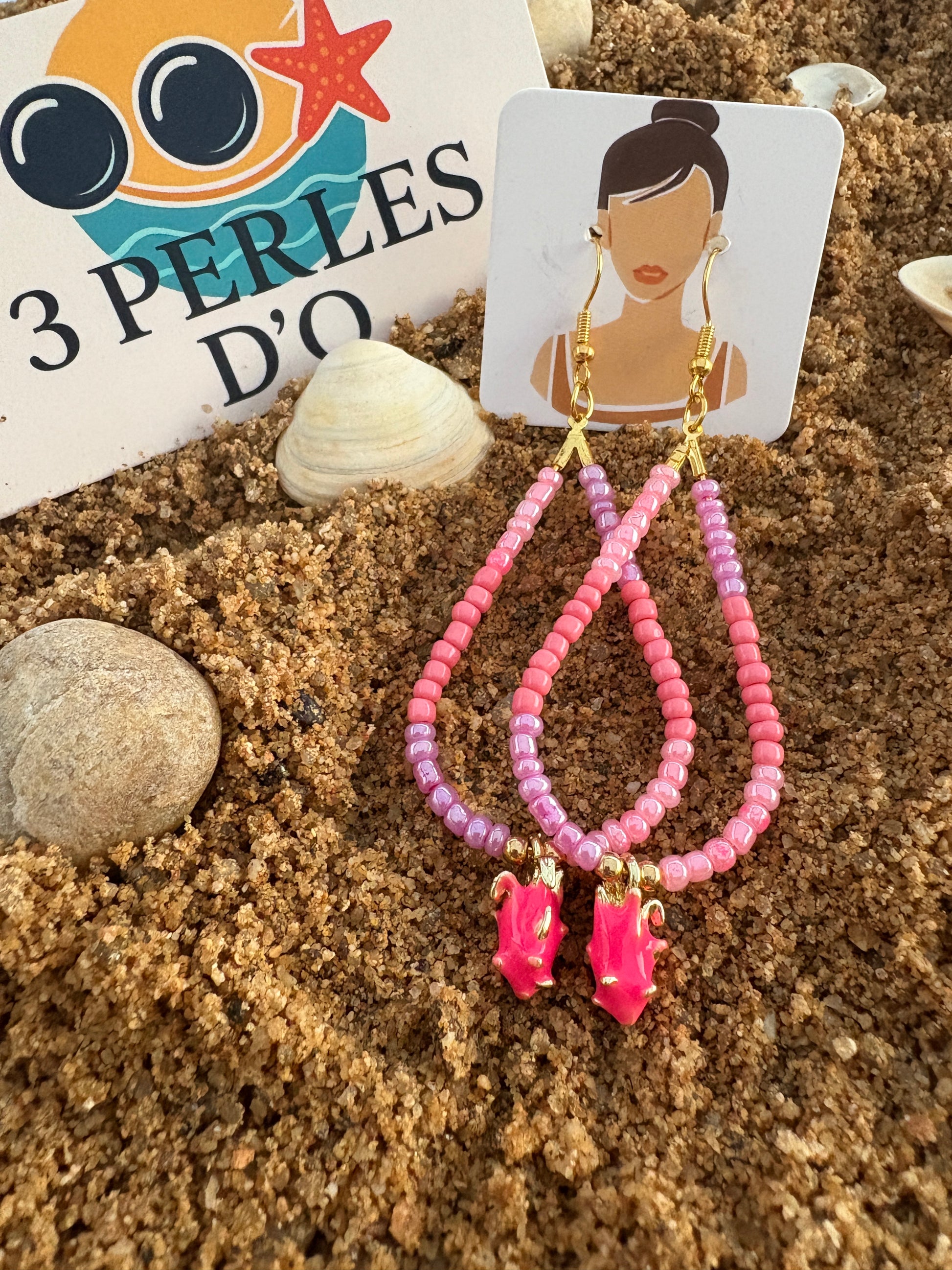 Les boucles d’oreilles Aurélie allient l’élégance délicate des perles de rocaille à une breloque unique en forme de fruit du dragon, apportant une touche d’originalité sophistiquée. Leur design raffiné met en valeur un savoir-faire artisanal. Légères et confortables, elles sont idéales pour un port quotidien ou des occasions spéciales, exprimant un esthétique moderne tout en conservant une note subtile d’exotisme.